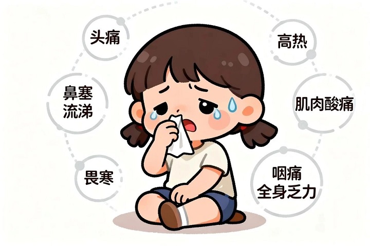 临床表现:区别于普通感冒的上呼吸道卡他症状,流感以突发高热(体温常达39℃以上)、全身症状重(显著乏力、头痛、全身肌肉酸痛)为典型特征。部分病例可进展为重症肺炎。
