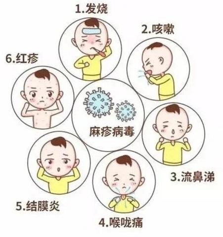 临床表现:典型症状可概括为“热3天、疹3天、退3天”。初期出现发热、咳嗽、流涕、结膜充血等前驱症状,随后口腔黏膜可出现特征性的柯氏斑。发热3-4天后出现全身性红色斑丘疹,出疹顺序自耳后、面部向下蔓延至躯干四肢。