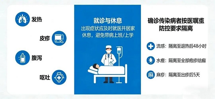 如出现发热、皮疹、腹泻、呕吐等症状,应及时就医并居家休息,避免带病上班/上学。