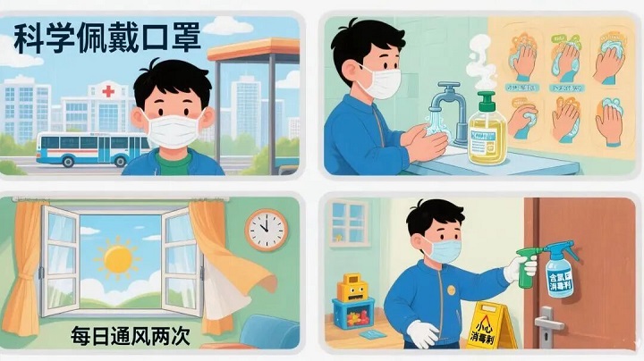 4.做好清洁消毒:对门把手、桌面、玩具等高频接触物体表面定期清洁消毒。处理患者的呕吐物/排泄物时,应佩戴手套,使用含氯消毒剂进行规范处理。